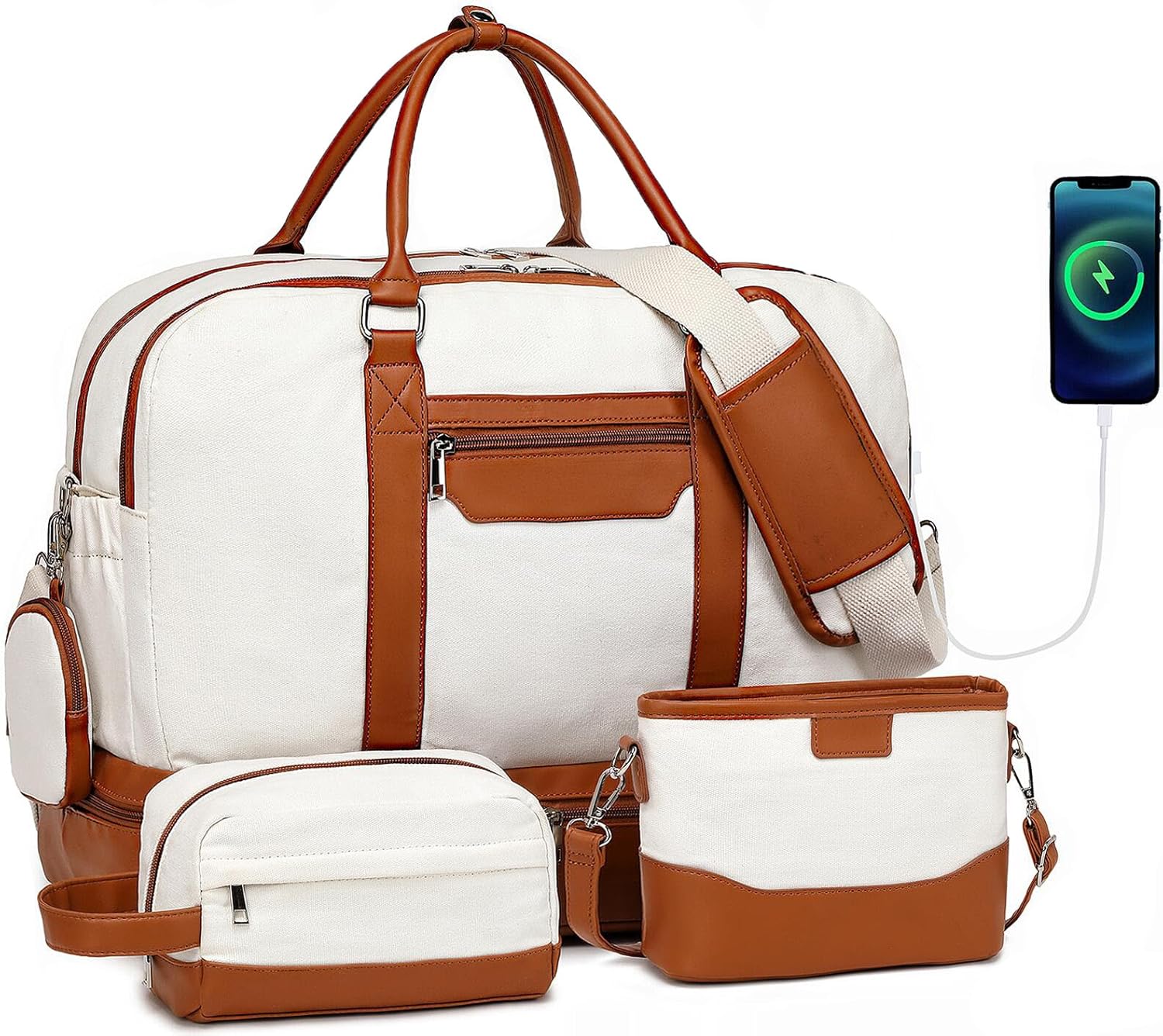 Travel Bag *1 (20 x 9.5 x 15 inch)Toiletry bag *1messenger bag *1Small wallet *1High-Quality Material: Quilted Polyester Cloth and Faux Leather Material (Waterproof & Light-Weight )