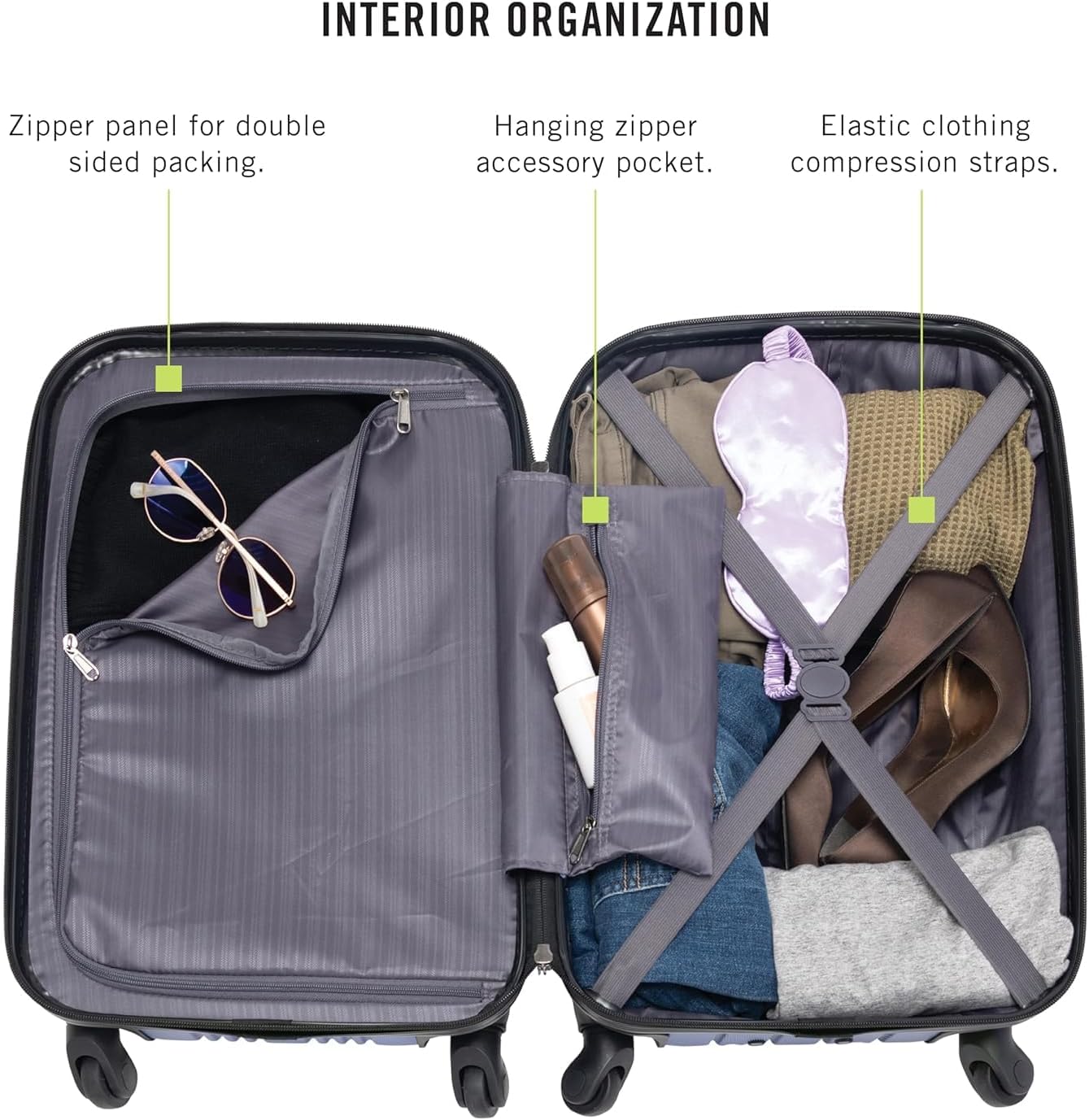 SPACIOUS INTERIOR with dual-sided packing. Utilize the compression straps and hanging zipper pocket to keep your belongings secure.