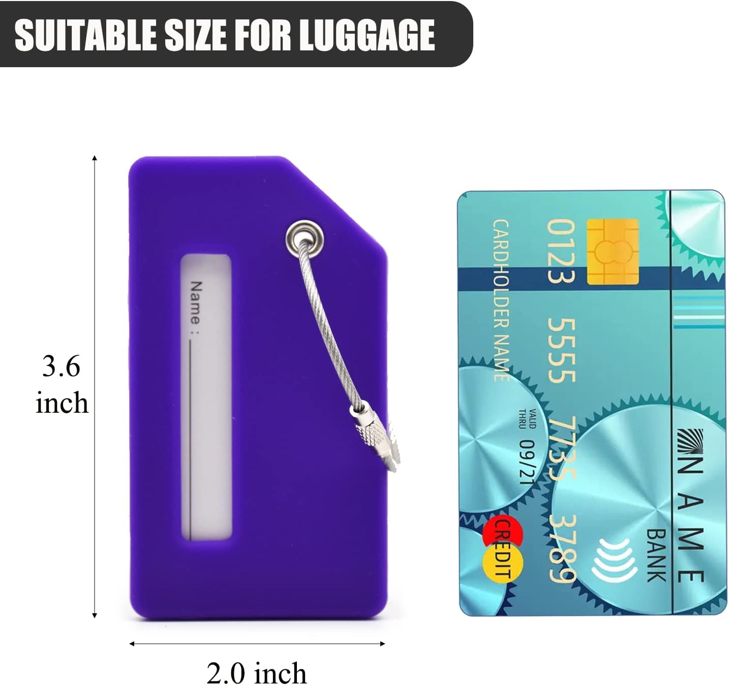 Luggage Tags Features Tags size: 3.6 X 2 X 0.25 inches Material: Silicon/Stainless Steel Color: Green/Red/Yellow/Purple/Orange/Blue/Black Package: 7 X Suitcase tag