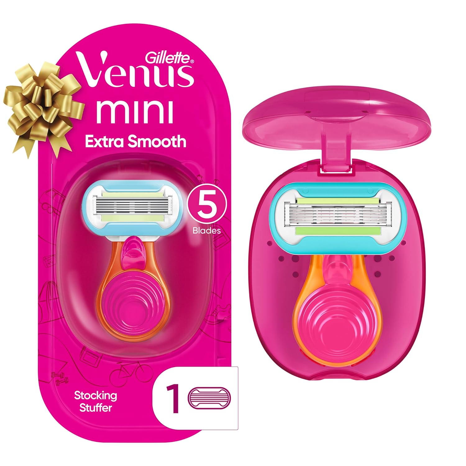 Venus female razor blades are designed with a woman’s body in mind. Venus Extra Smooth On-The-Go women’s razors come with a mini handle and travel case for on-the-go use. This razor features our Extra Smooth blade refill which delivers a close, controlled shave. The razor blade refills have 5 diamond-like coated blades, to closely cut hair with ease, for an extra smooth shave that lasts and a lubrastrip, with a touch of avocado oil, for smooth glide. Give yourself a long-lasting shave with 10x more lubrication (vs Venus Smooth). The razor blade refills also have a pivoting head that adjusts to your curves, including ankles and knees. No awkwardly angling your razor. These female razor blades cut hair closer to the skin, for a longer-lasting smooth (vs Venus Smooth razor for women). Each blade refill lasts up to 30 days of shaves (based on twice/week shave). The mini travel handle will fit any Venus razor blade refill cartridge (except Simply Venus and Venus Pubic Hair Razor). The mini handle is designed to last so you only need to change your blades.