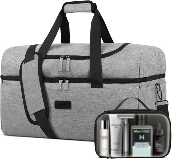 Separate Shoes Compartment: The duffle bag for travel has a separate upper shoe compartment that can accommodate 2 pairs of men’s shoes or dirty clothes. It can keep shoes clean and odour-free, also avoid dirtying other clothes when packing, provide more convenience for your travel. It’s a great choice to keep your essentials organised when travelling.