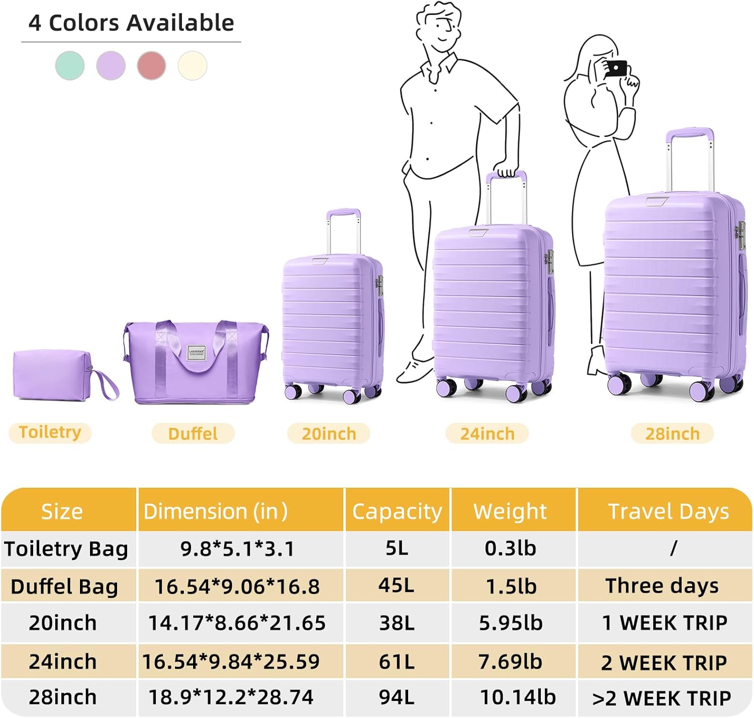 Five-Piece Luggage Sets: The luggage set includes a versatile range of sizes – 20-inch, 24-inch; and 28-inch suitcases, along with a travel bag and a toiletry bag. Each item serves a specific purpose, providing a comprehensive solution for various travel needs.