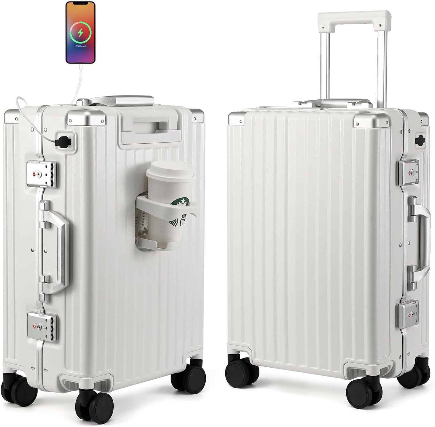 INNOVATIVE DESIGN:Multifunctional luggage with cup holder and USB port,also an ingenious hook design.