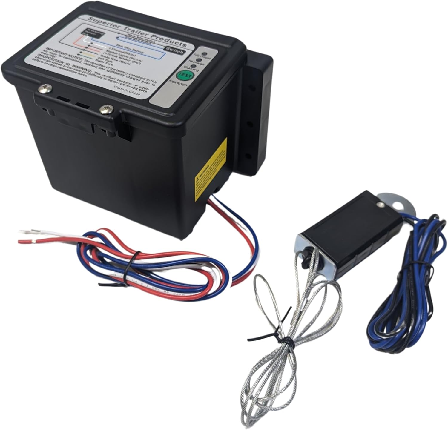 Trailer Breakaway Kit includes: 5-amp-hour battery, breakaway switch, breakaway cable, built in charger, top load battery box and wiring. Meets DOT Requirements.