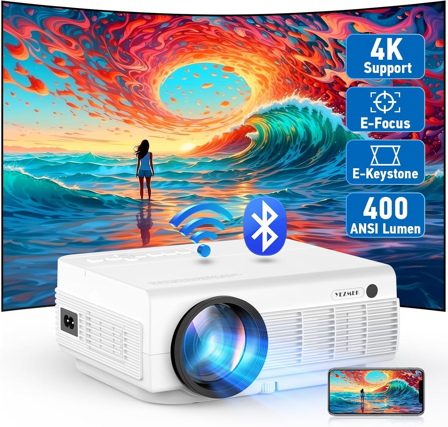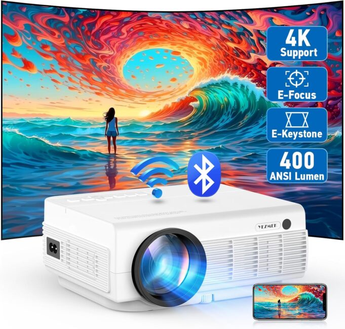 【Faster 5G WiFi & Bluetooth Connection】 Equipped with the latest 2.4G/5G WiFi & Bluetooth Chip, this YEZMEK projector with wifi and bluetooth provides not only faster WiFi connection with the most iOS and Android devices, but also more stable signal transmission channel. Meanwhile, it’s also possible to connect Bluetooth soundbar, speaker or earphone to this projector via the Bluetooth function to get a better sound quality for your home theater needs indoors and outdoors.