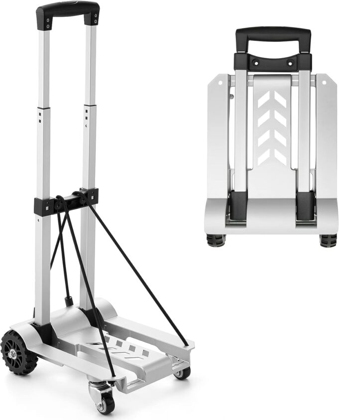 【Convenient and Easy to Store】The foldable hand truck can be easily folded up in seconds, is small in size, and is lightweight (5 lbs). Folds to fit in a backpack, in the car, under the bed, in a closet, or in the garage. Folded Dimensions: 17.7 x 10.63 x 4.13 inches.