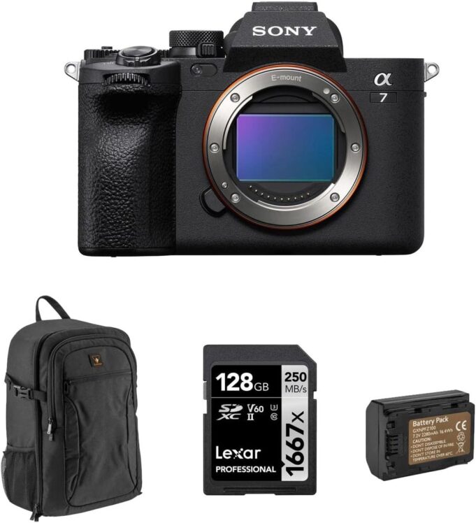 SONY ALPHA A7 IV CAMERA BUNDLE INCLUDES: Alpha a7 IV Camera | Battery | Charger | Body Cap | Eyepiece Cup | Multi Interface Shoe Cap | USB-A to USB-C Cable | Shoulder Strap | 128GB SD Card | Backpack | Extra Battery