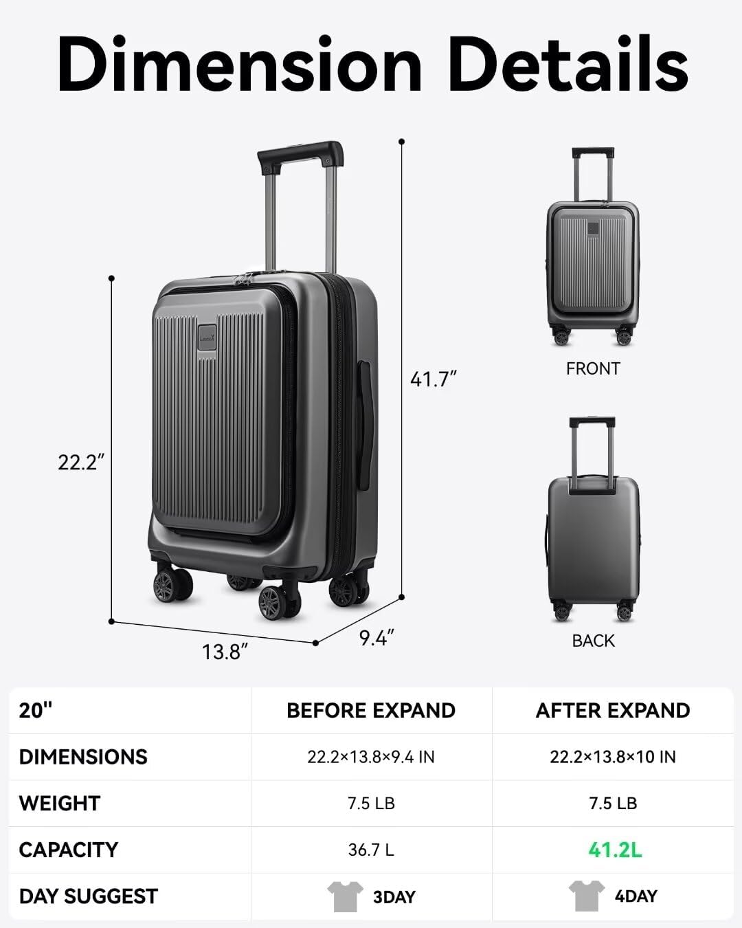 Effortless Accessibility: With the front section capable of accommodating a 15.6-inch laptop, LUGGEX luggage with front pocket offers quick access to essentials while traveling by train or at the airport. Save time and travel effortlessly with our thoughtfully designed carry-on suitcases.