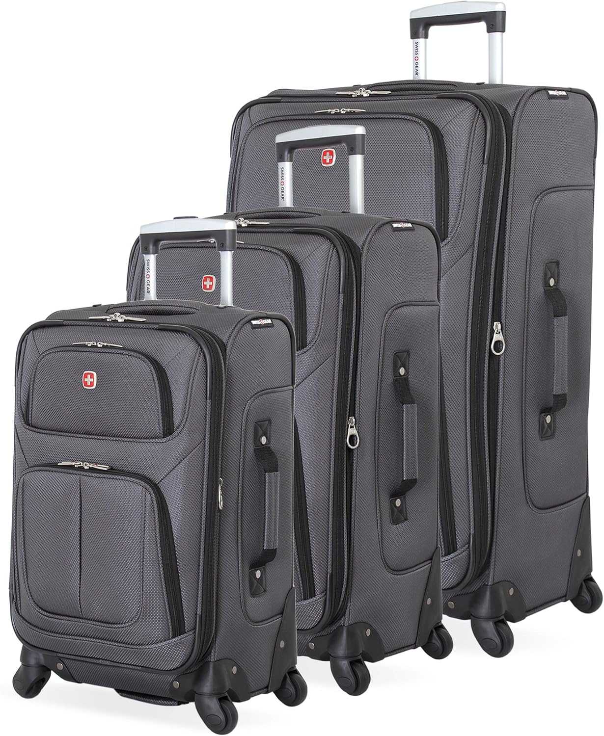 The SwissGear Sion Expandable Spinner Luggage Collection features a locking push/pull handle system and four 360-degree spinner wheels for superior mobility. Made of durable, scuff-resistant polyester fabric, its interior is fully lined and features adjustable luggage tie-down straps, a removable zippered wet bag, a large mesh lid pocket, and a packing pocket for holding small items and accessories. Other features include two front panel pockets, a built-in ID tag, and a padded top grab handle.