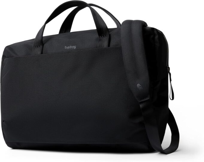 Detachable padded shoulder strap for comfortable carry on long commutes; soft-edge webbing handles