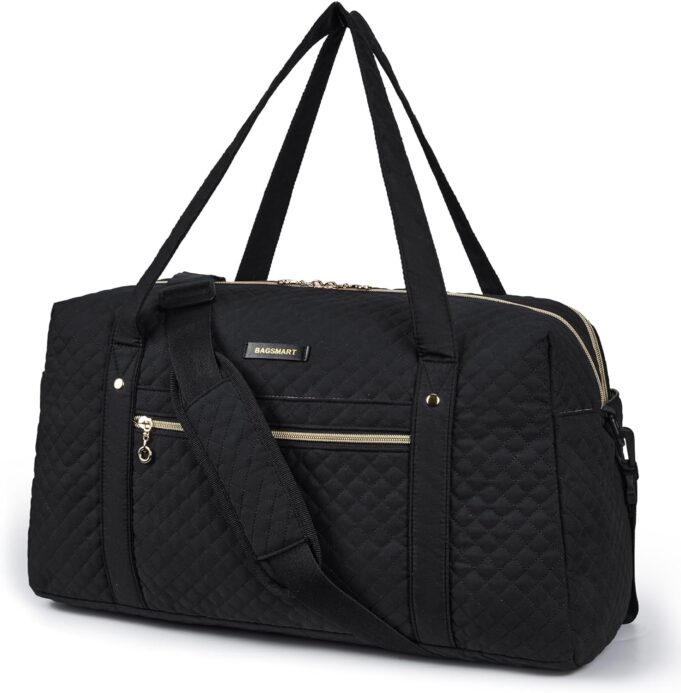 Customers like the roomy, style, and travelability of the duffel bag. They mention it’s pretty, has a nice color, and the gold accents really pop against the black. Some appreciate the size, saying it fits under AA seats nicely. Customers also say the bag is well-made with good padding.