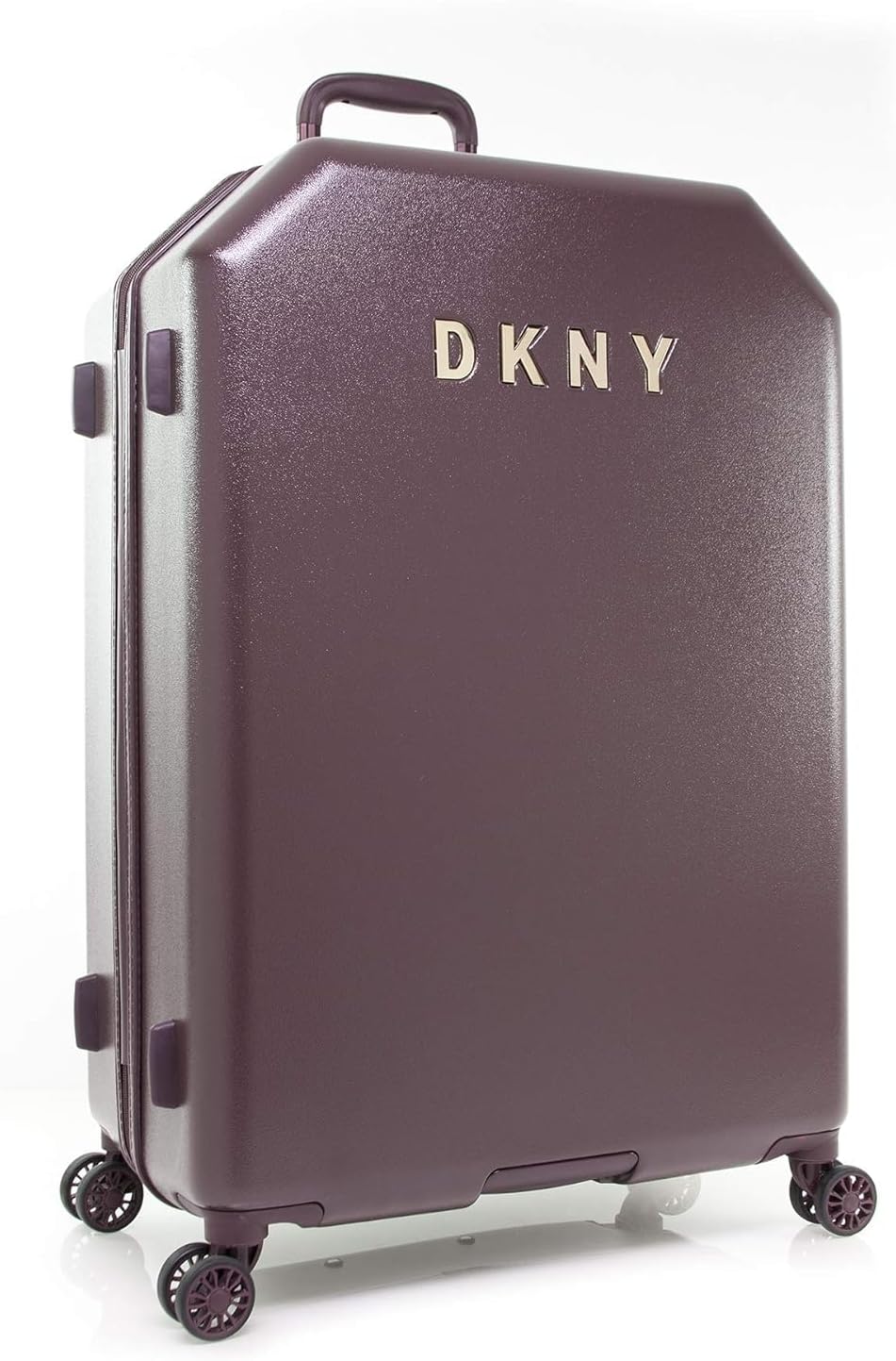Travel in style with the DKNY Metal Logo collecton! Its unique shape is sure to make a statement everywhere you go. Scratch-resistant ABS/PC shell with built-in TSA lock, 8 spinner wheels, adjustable trolley handle with top and side comfort grip carry handles, and fully lined interior with compression straps and multiple pockets. Packing dimensions: 27.80″ x 19.70″ x 12.20″. Weight: 10.70 lbs