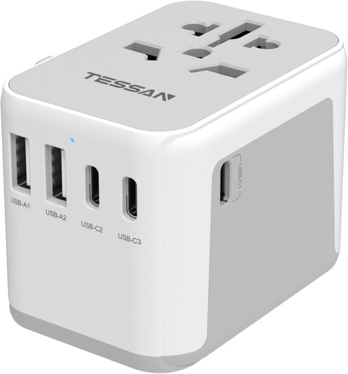 Universal AC Adapter: Accepts US/EU/ AU/UK plugs. 3 USB-C & 2 USB-A Ports: Compatible with all USB-charged devices, like cellphones, tablets, cameras, etc. You can also share with your family or friends in hotel with limited plug sockets.