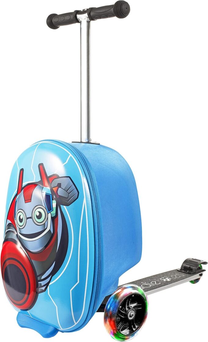 Functionality | Easy tilt steering with a leaning motion. Slip-proof standing deck to ensure safe scooting. Folds and locks in place. Converts into a conventional roller travel bag. Entertains your child, which will mean traveling is fun for them and easier on you.