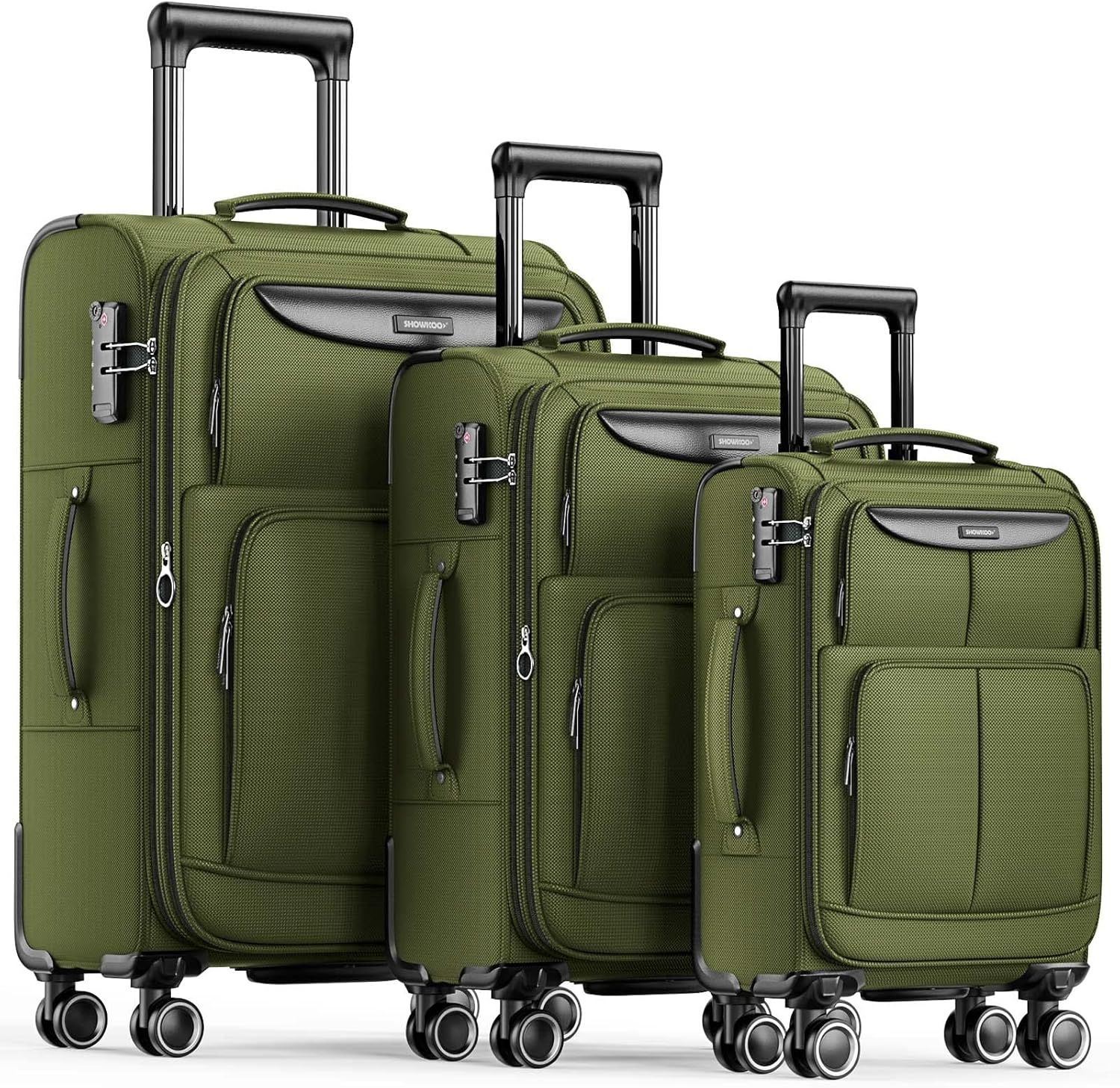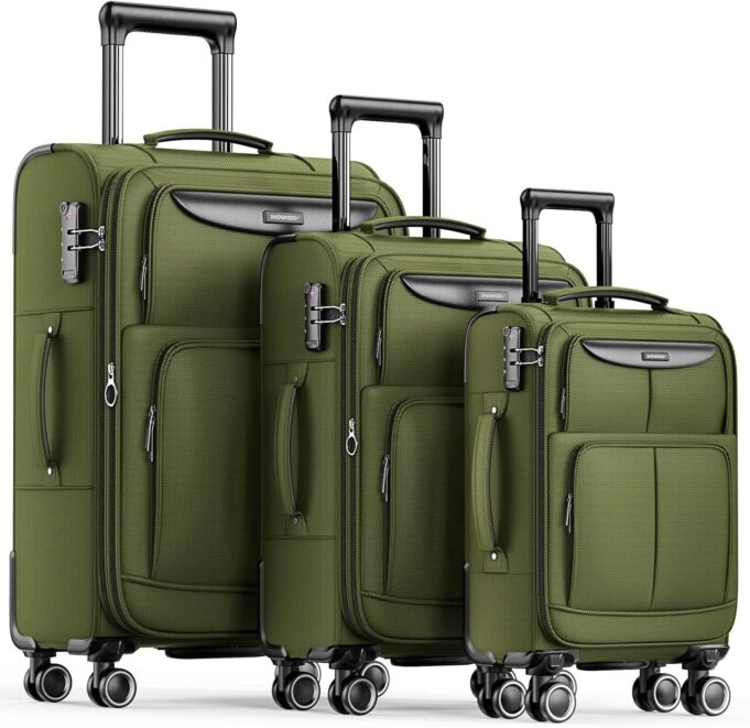 Top Softside Luggage Sets: Made of high-density oxford fabric, resists stains and waterproof, high abrasion resistance to keep the softside softshell luggage beautiful. 20 inch is the most suitable to carry around, 24in & 28in can expand 20% of the increase space. Capacity: 20in43L 24in63L 28in 85L.