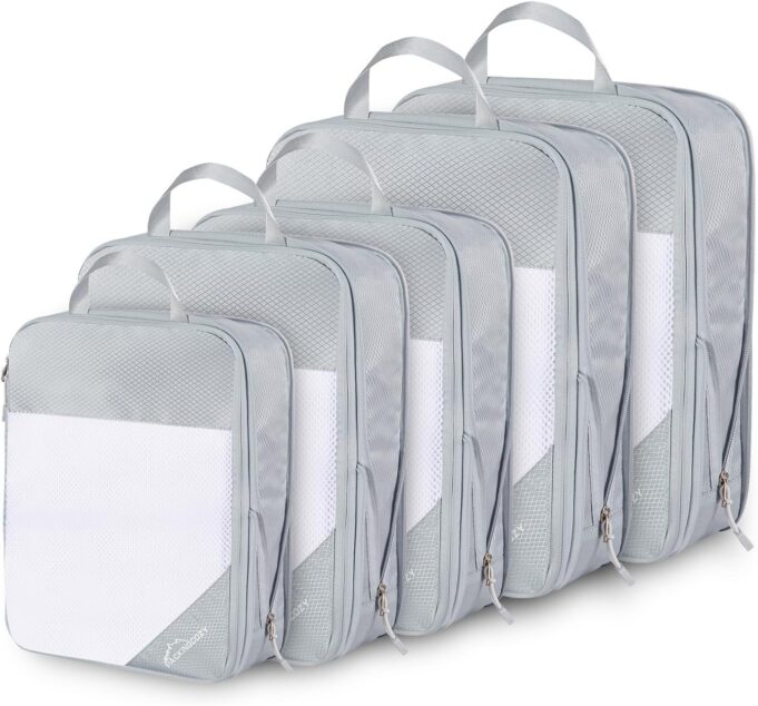 PACK LIKE A PRO: Our 5-set compression packing cubes for travel Include 5 compressible packing cubes in 3 different sizes. This suitcase organizer bag set fits ideally inside all sizes and brands of luggage, making it easy to keep your luggage organized and tidy.