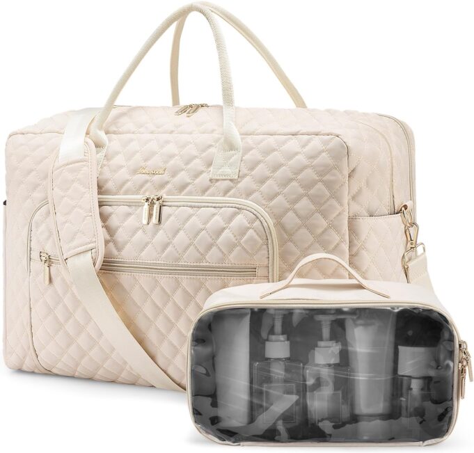 Customers like the space, build quality, and color of the duffel bag. They mention it’s roomy, has 2 separate compartments, and is well-made. Some appreciate the look and color of the bag. What’s more, they say it makes a nice travel companion bag. Customers also say the size is perfect to carry on a flight and easily fits clothes and cosmetics for a short trip.