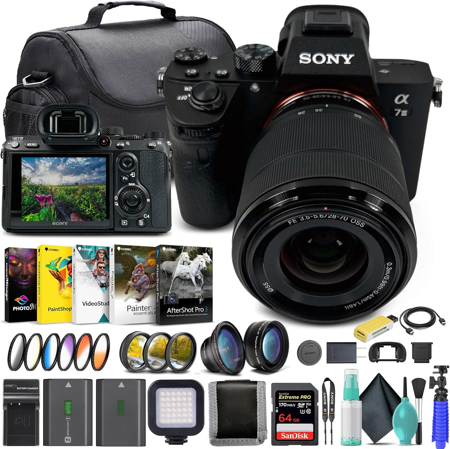 SONY USA Authorized Model Includes Full USA SONY Warranty. Bundle Includes: 1 – Sony Alpha a7 III Mirrorless Digital Camera with 28-70mm Lens, 1 – SecureDigital 64GB Extreme PRO Memory Card, 2 – NP-FZ100 Rechargeable Lithium-Ion Battery, 1 – Corel Photo Software, 1 – Large Padded Case, 1 – NP-FZ100 charger, 1 – Memory Card Reader, 1 – Mini Portable LED Video Light , 1 – 3 Piece Pro Filter Kit UV/CPL/F 55MM, 1 – Wide Angle Lens 55MM, 1 – Telephoto Lens 55MM + more…