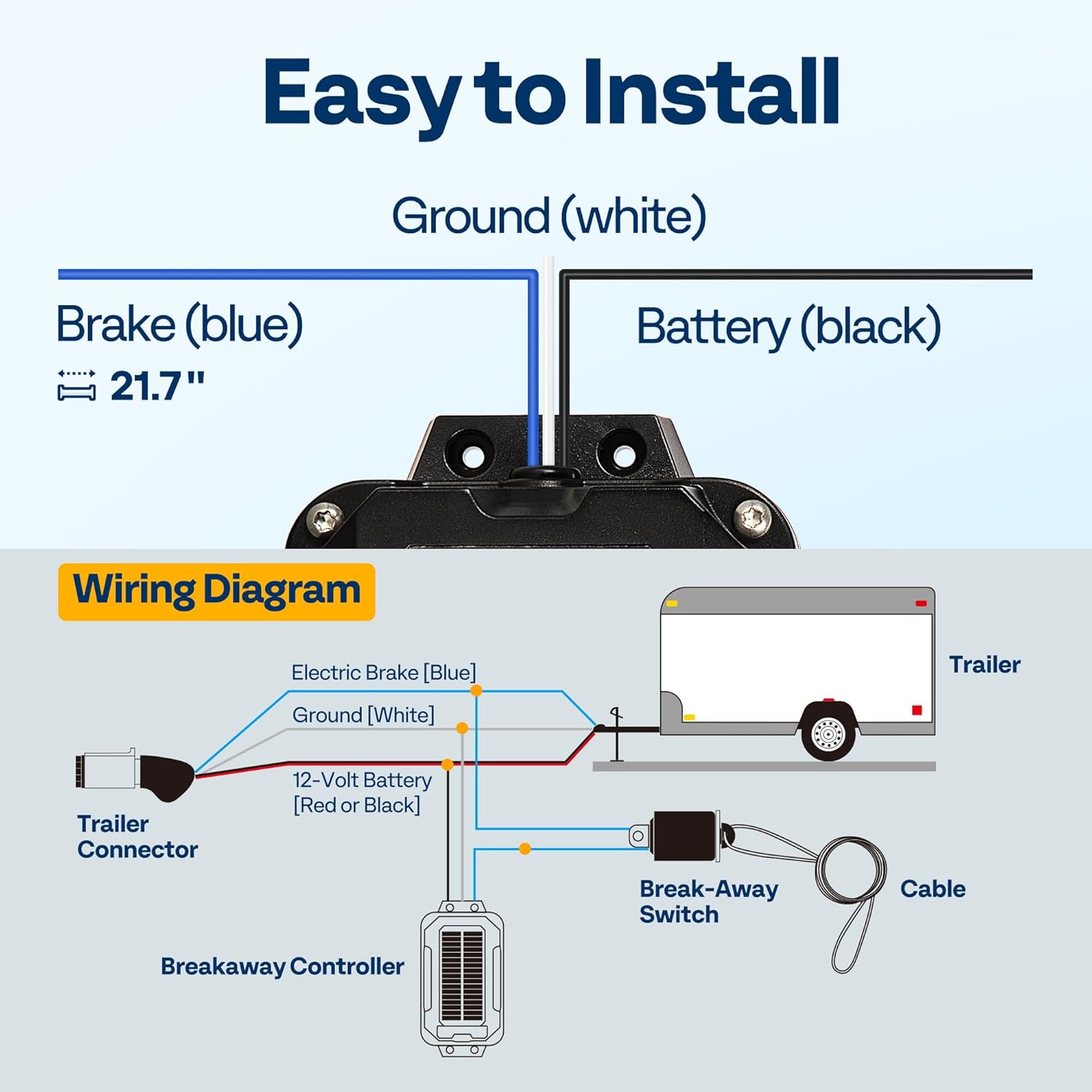 EASY TO INSTALL – The solar trailer brake controller kit comes with color-coded cables for the battery (black), brake (blue), and ground (white); The side-mounted design does not require complex installation steps and is fast and convenient to install; The breakaway switch is equipped with flexible cable, and the battery box features pre-drilled mounting holes