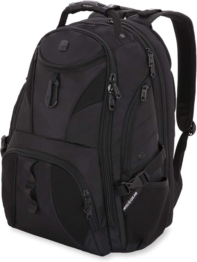The SwissGear 1900 ScanSmart Laptop Backpack is a highly functional backpack for taking your tech on the go. It features a padded, TSA-friendly SmartScan tech compartment that fits a 17” laptop and 10” tablet and lays flat through airport security, as well as built-in RFID scan blocking technology to keep your information secure. An impressive array of integrated organizers keep essential pens, keys, and other electronic accessories within reach. The Airflow back panel and ergonomically contoured suspension straps feature padding and mesh fabric for maximum comfort and reflective accents for improved nighttime visibility. Handle with ease thanks to reinforced grab handles and exterior compression straps. With elastic mesh water bottle pockets, exterior quick access pockets, and a pass-thru trolley sleeve for luggage compatibility, this bag is packed with convenient features that add delight to your daily carry. Plus, this backpack comes with a 10 year warranty against defects in materials and workmanship.