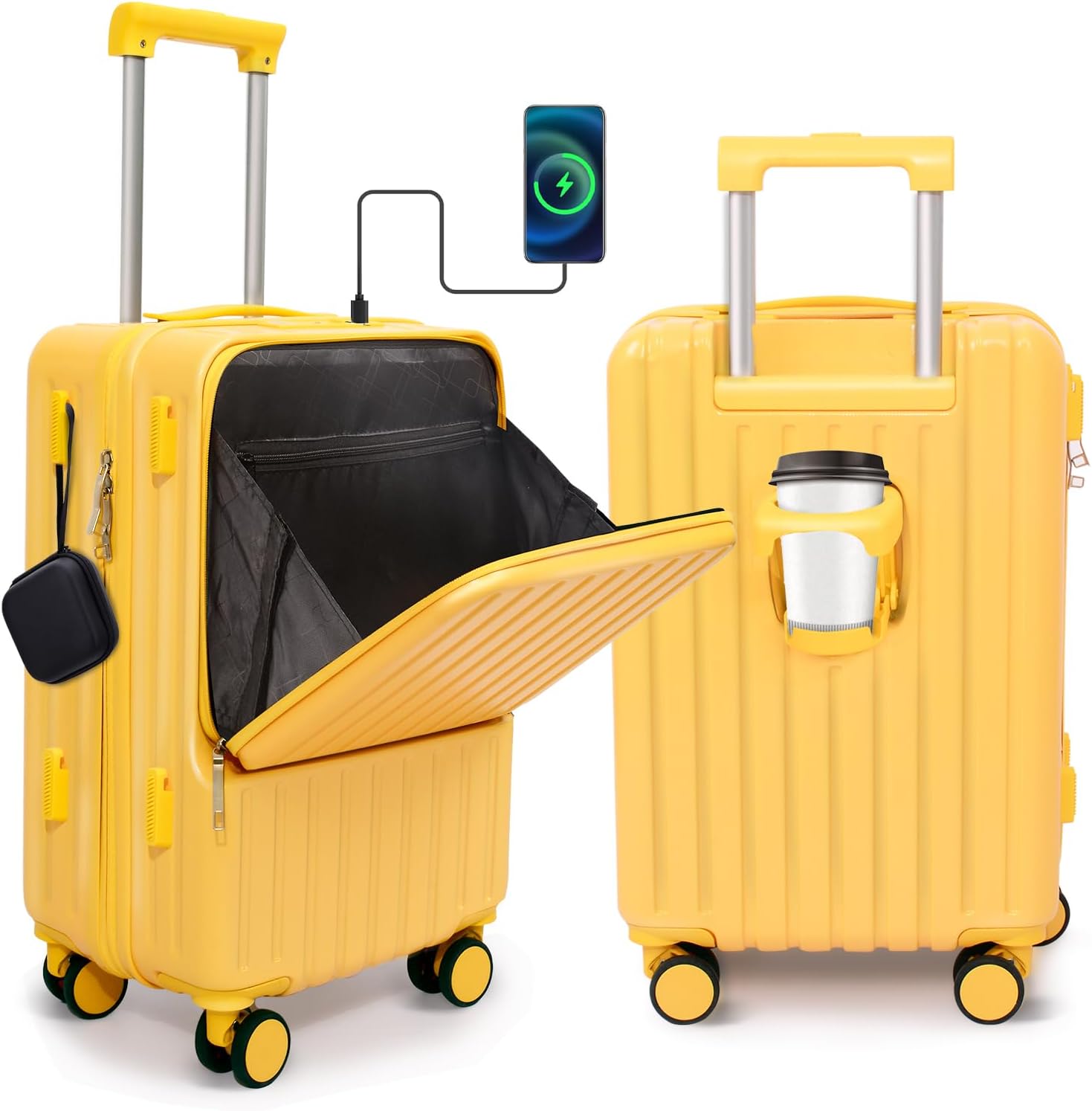 TRAVEL FREE: The built-in hooks and cup holders in the suitcase make it easy to put your cups and small items in a place. These thoughtful designs make your travelling easier and free your hands. The interior of the suitcase is equipped with wet and dry separate storage zones, large capacity and convenient for you to classify your belongings.