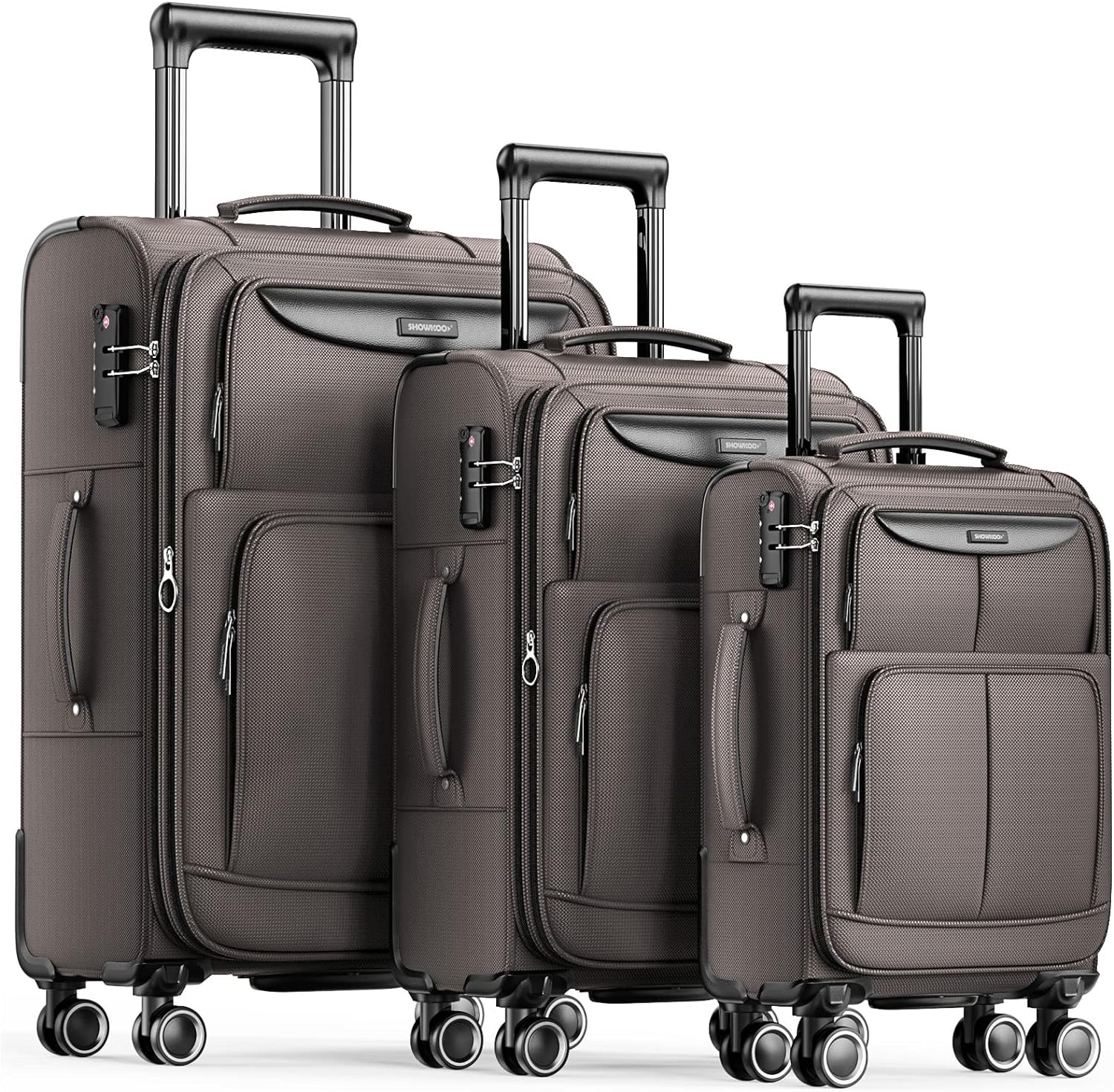 Top Softside Luggage Sets: Made of high-density oxford fabric, resists stains and waterproof, high abrasion resistance to keep the softside softshell luggage beautiful. 20 inch is the most suitable to carry around, 24in & 28in can expand 20% of the increase space. Capacity: 20in43L 24in63L 28in 85L.