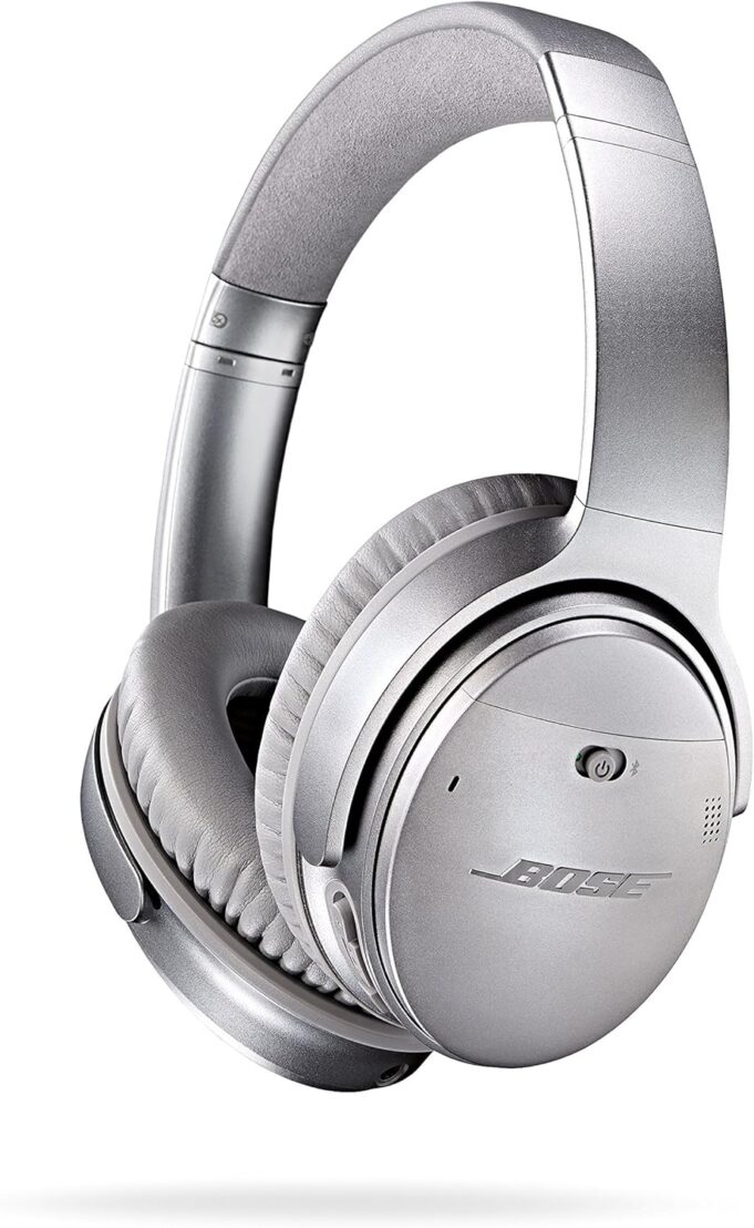 Quiet Comfort 35 wireless headphones are engineered with world-class noise cancellation that makes quiet sound quieter and music sound better. Free yourself from wires and connect easily to your devices with Bluetooth and NFC pairing. Volume-optimized EQ gives you balanced audio performance at any volume, while a noise-rejecting dual microphone provides clear calls, even in windy or noisy environments. Voice prompts and intuitive controls make communicating and controlling your music hassle-free. A lithium-ion battery gives you up to 20 hours of wireless play time per charge. And if you anticipate a situation where charging may not be possible, just plug in the included audio cable. Wired mode gives you up to 40 hours of play time per charge. Premium materials make these headphones lightweight and comfortable for all-day listening. Use the Bose Connect app for a more personalized experience. Included: Quiet Comfort 35 wireless headphones; USB charging cable; backup audio cable; airline adapter; carry case.