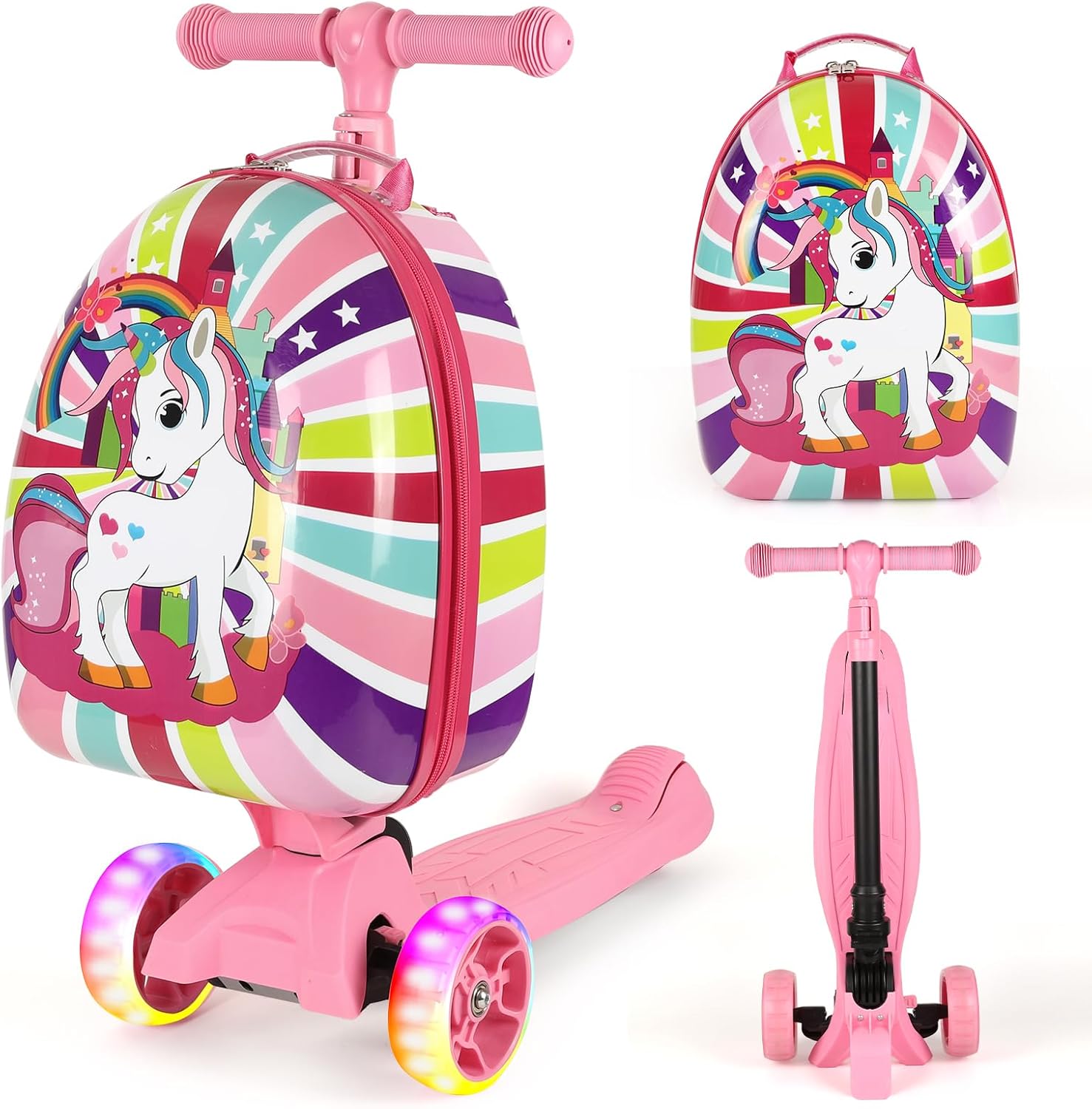 【SPECIAL FUNCTION】The Kids scooter luggage can be detached,you can used it as an separate scooter or suitace, and can be folded to save space and fits in cabin’s overhead bins . Lightweight and easy to ride, carry or pull for independent toddlers and children. Illuminated LED wheels roll smoothly. Made of waterproof, plastic-free polyurethane so it won’t crack or lock. Which will make traveling is fun for kids and easier on you.