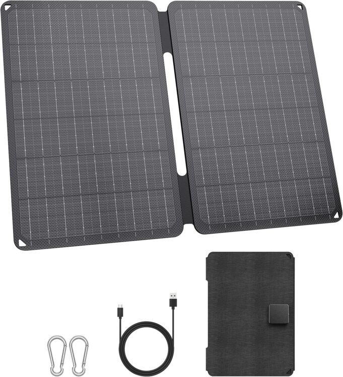 【Foldable and Lightweight Design】:The solar panel for camping is foldable and lightweight,weighing only 1.04 pounds and folding down to the dimension of 11.02*7.28*0.787 inches, making it easy to carry. You can easily put it into your bag,hold it in your hand,or hang it on your backpack with the 2 included carabiners, perfect for hiking,camping or other outdoor activities