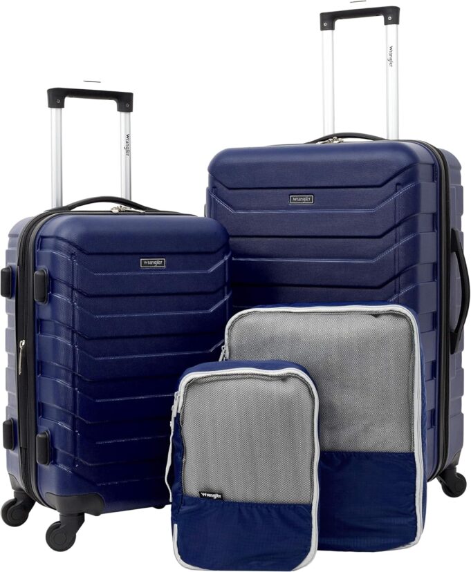 Wrangler 4 Piece Set Includes: 25″ Hardside Expandable Check-In Suitcase, 20″ Hardside Expandable Carry-On Luggage, 15.5″ Packing Cube, 12″ Packing Cube