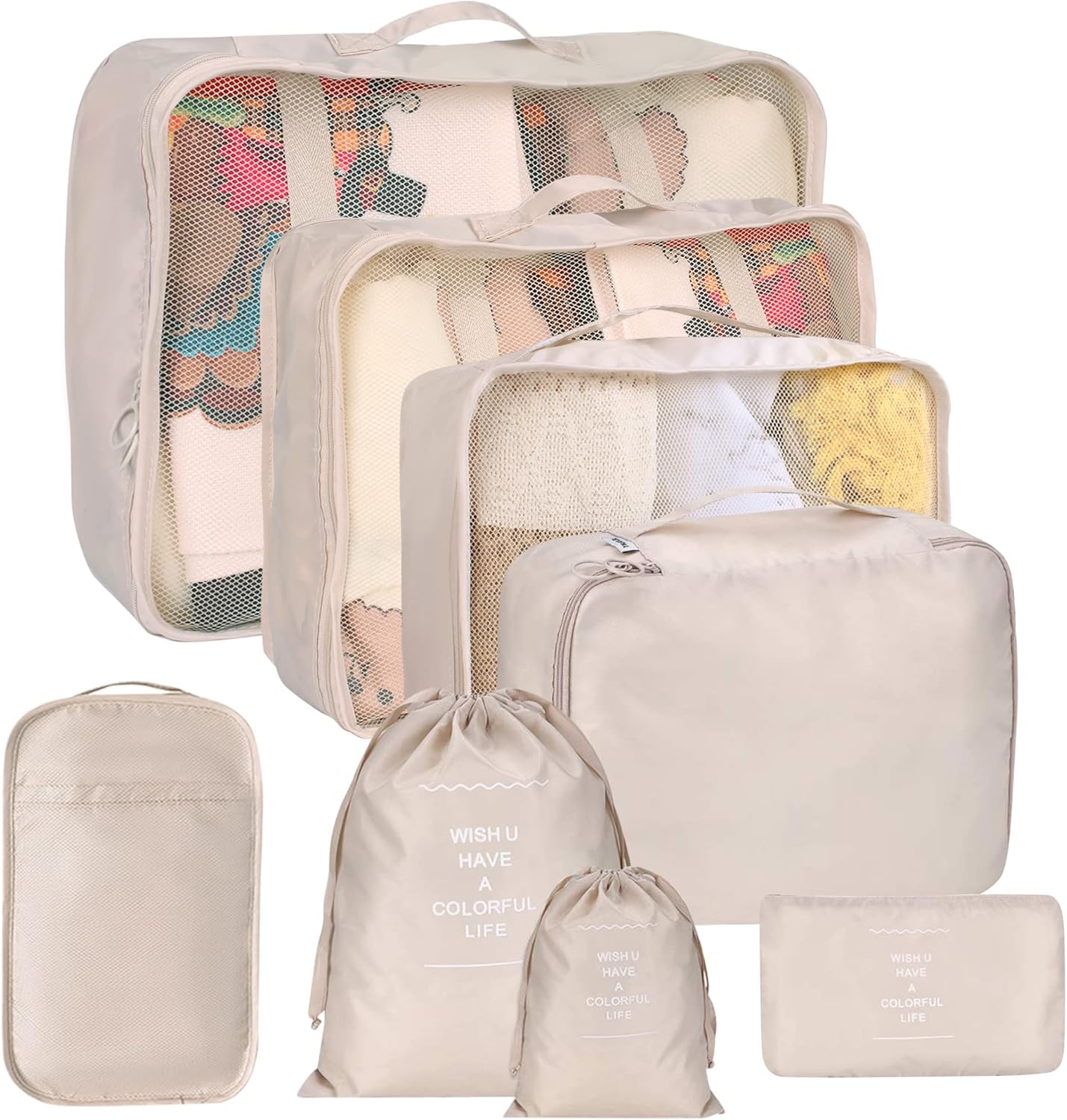 Quality Fabrics:Mesh top panel, easy to identify content and ventilate these cubes will go a long way. There are no broken zippers, no weak stitches. The smooth fabric protects your clothes from wrinkles and stains. High-performance features ensure that the packaging cube can withstand high-density wear during travel. The waterproof function protects your clothes from splashes or leaks.