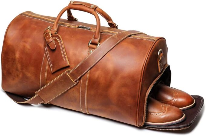 ✔Size and Design :Size 22.8”*9.8”*12”, Large capacity design makes our sophisticated Duffel Bag satisfy the demand of the daily life and work; Exterior side pockets slot designed for easy access to stow your Shoes, This leather travel bag is your go to carry machine Use it for a weekend vacation, gym or for just running around town