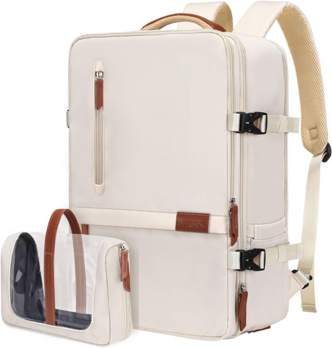Multi Compartment Design: This backpack has 3 main compartments, 1 shoe compartment and comes with a toiletry bag. Holds about 40L. The main compartment is fully open to hold your travel clothes. Front pocket is a dry and wet separation layer, which can help you sort and place sweaty clothes, wet towels, etc. Back pocket is a laptop compartment that fits 17.3 inch laptops. One shoe compartment on the bottom of the backpack to separate shoes and everything else clean.