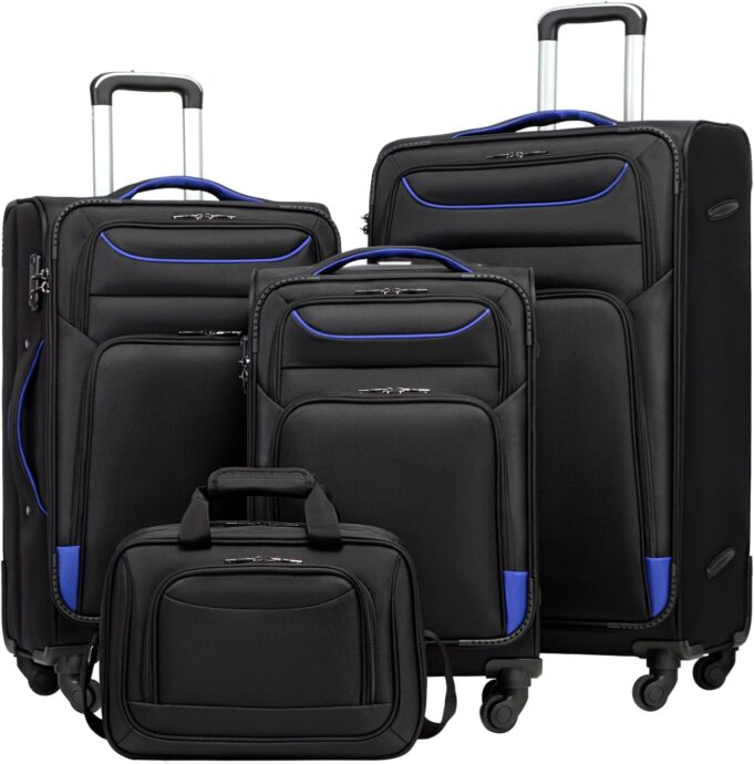 The sets include a 20 inch carry-on luggage, 24 inch medium luggage, 28 inch large luggage and a 15 inch tote bag.
