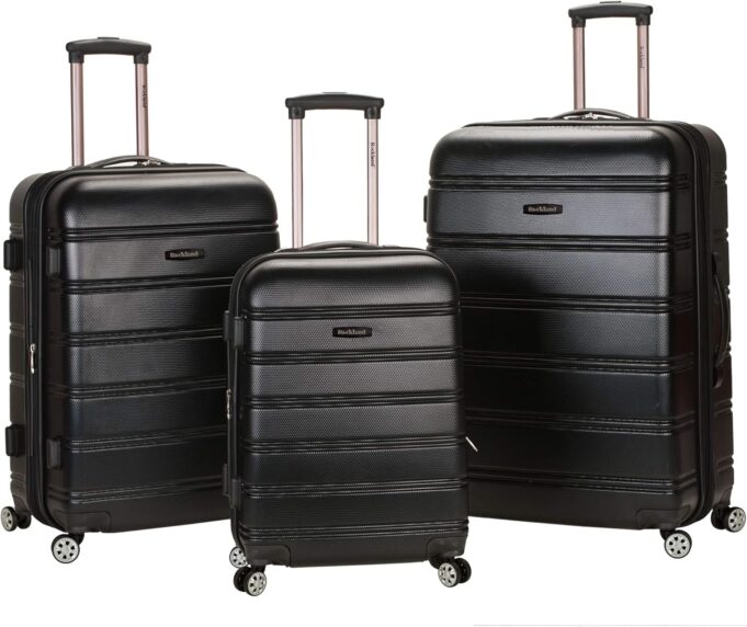 This 3 piece. Set is made of abs. The major benefits of this material – it is extremely lightweight, it is durable, and protects the contents of your luggage. Eight multi directional spinner wheels rotate 360 degrees for easy maneuverability. This luggage allows you to pack more while avoiding the excess weight surcharges imposed by most airlines. Features: expandable multi-directional spinner wheels for easy maneuverability modern internal chrome telescoping handle with push button handle. Interior mesh and zip pocket and elastic pocket. Measures: 20 inch x13 inch x9 inch weighs 6 lbs., 24 inch x15 inch x10 inch weights 8 lbs., 28 inch x17 inch x12 inch weighs 10 lbs.