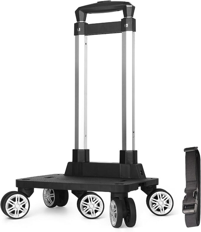 【Sturdy Quality】The luggage travel cart uses thickened aluminum and thickened PP material platform, which is stronger and more stable in load-bearing. This luggage dolly can support backpacks weighing up to 55lbs. Equipped with silent and wear-resistant wheels, it is very effortless and smooth to use.