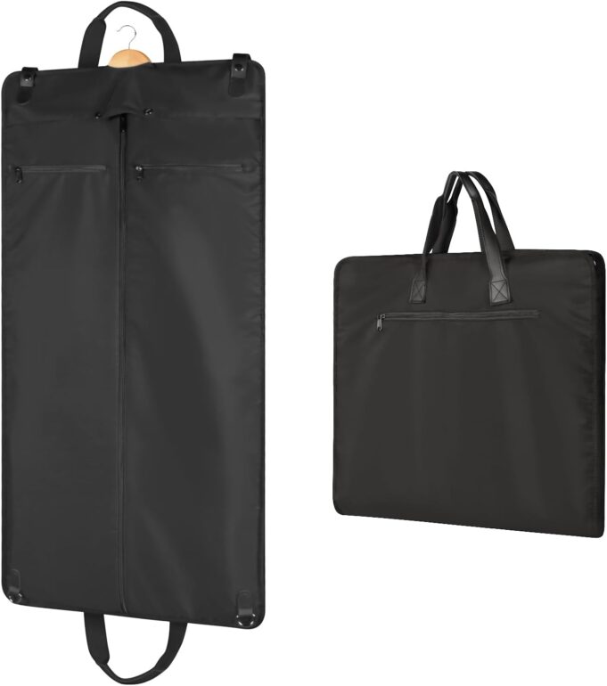 Foldable Travel Bag – This suit bag has 2 leather buckles that make it easy to fold the bag. Wide carry handles on top and bottom for easy attachment to rolling luggage for airport convenience. Its foldable design ensures that it compacts down efficiently, taking minimal storage space.