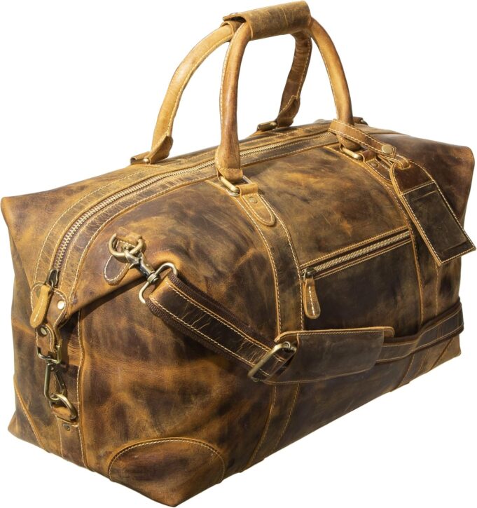 HIGH QUALITY LEATHER DUFFEL BAG — These durable and large capacity duffel bags are made of full grain genuine leather. 100% handmade product, excellent stitching and manufacturing. Smart design, retro fashion Style, YKK Zippers and Metal Feet. It is easy to convert into a cross or shoulder bag of your choice.