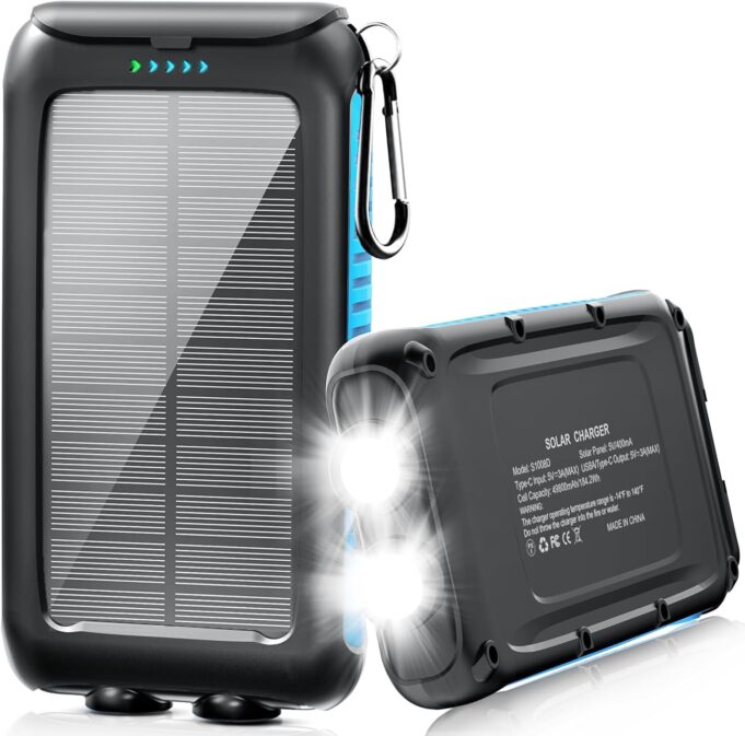 👍Outdoor Waterproof Portable Design: The solar phone charger has a protective cover attached to the outside of the charging/discharging port, so it has a waterproof and dustproof function. In addition, it comes with a carabiner clip that you can hang on your backpack, perfect for outdoor camping, hiking, traveling, cycling, fishing, beach, etc. What you will get: 1*49800 mAh Solar Power Bank, 1*USB Cable, 1*Carabiner, 1* Users Manual, 24-hour friendly customer service.