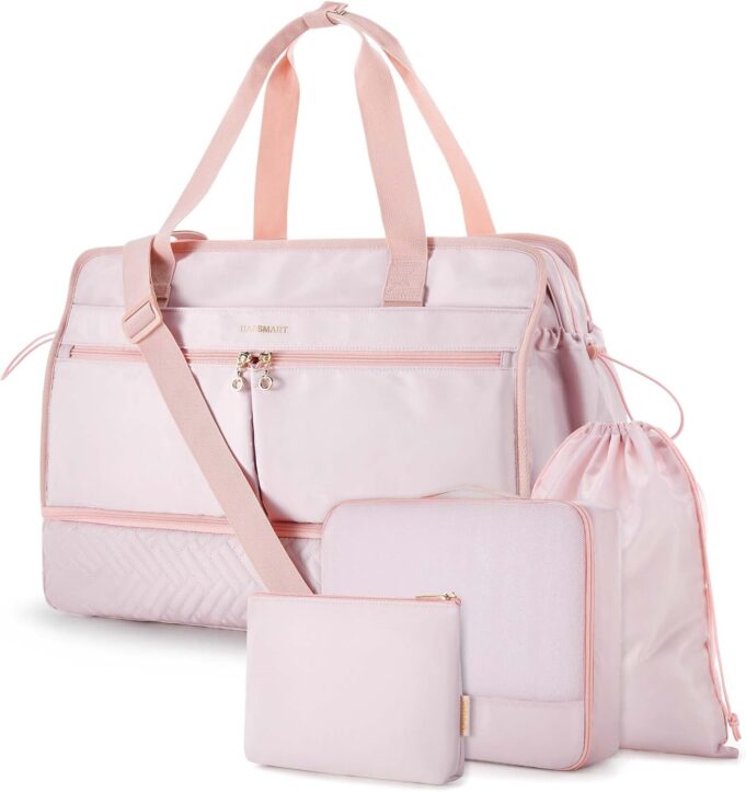 Customers like the storage capacity, material quality, and design of the tote bag. They mention it has many pockets for organizing, a built-in wet bag, and several extra bags for makeup, shoes, and dirty clothes. Some say it’s a great bag for the money and a nice travel bag.