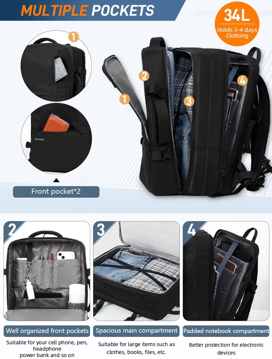 Versatile Carry On Backpack: Our Personal Item Backpack measures 45 x 30 x 14 cm when not fully packed. If you need more space, it expands to 45 x 30 x 25 cm. Additionally, a secure anti-theft zippered pocket on the back is perfect for storing your valuables, such as your phone and wallet.