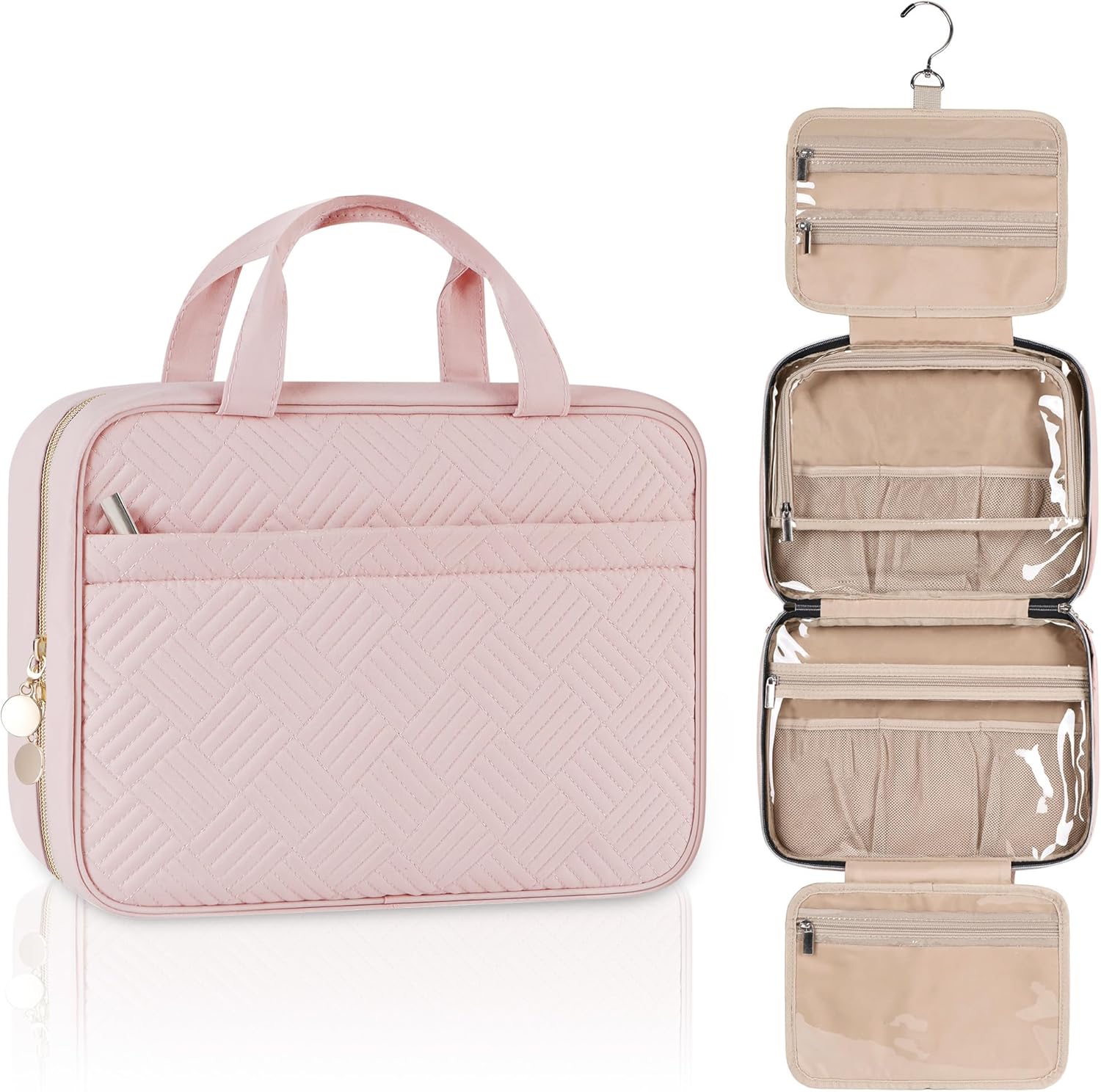 CONVENIENT DESIGN: Say goodbye to countertop chaos! Our hanging toiletry bag is equipped with a stow-away 360-degree swivel non-slip metal hook, offering versatile hanging options wherever you go. The carry handle doubles as a hanging strap, and the durable metal double zipper ensures longevity