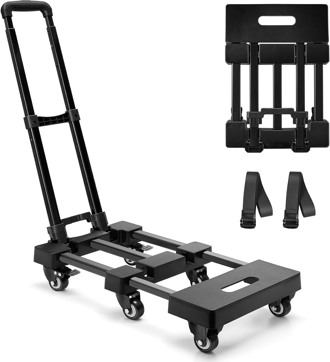 【Free 2 Zinc Alloy Buckle Lashing Straps】This folding hand truck comes with 2 pcs thickened zinc alloy buckle lashing straps, you can adjust the length freely. The high-density tight bite design of Lashing Straps makes sure the goods are more stable when transporting, especially when carrying large-size boxes and heavy stuff, and ensures the goods won’t slip off and not roll over when transporting.