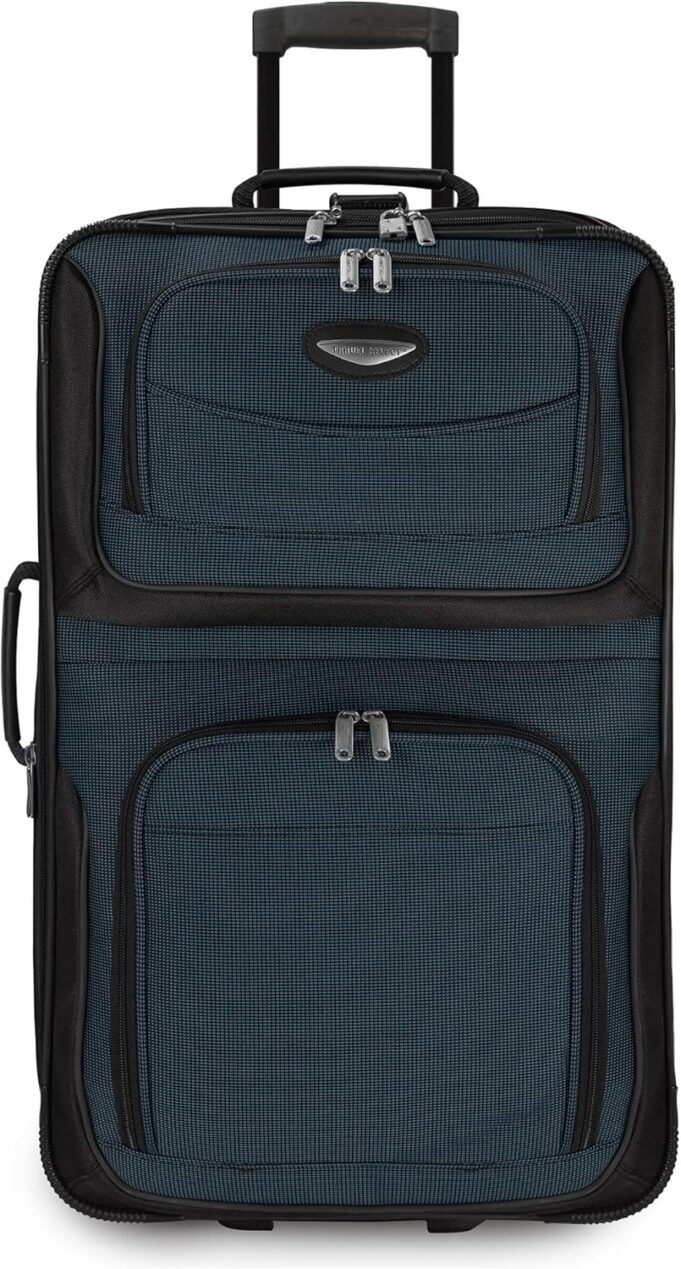 Travel in sturdy and affordable style with this 25-inch expandable rolling luggage by Travel Select. This deluxe set features expandability on all upright cases. It is made of superior two-tone polyester fabrication with PVC backing. It features inline skate wheels and an internal retractable push-button handle system for rolling ease and comfort. It has multiple front zippered pockets. It has an add-a-bag strap and clasp for toting an additional bag. Product Dimensions: 25” H x 15” W x 9” D (expands to 11 in. D).