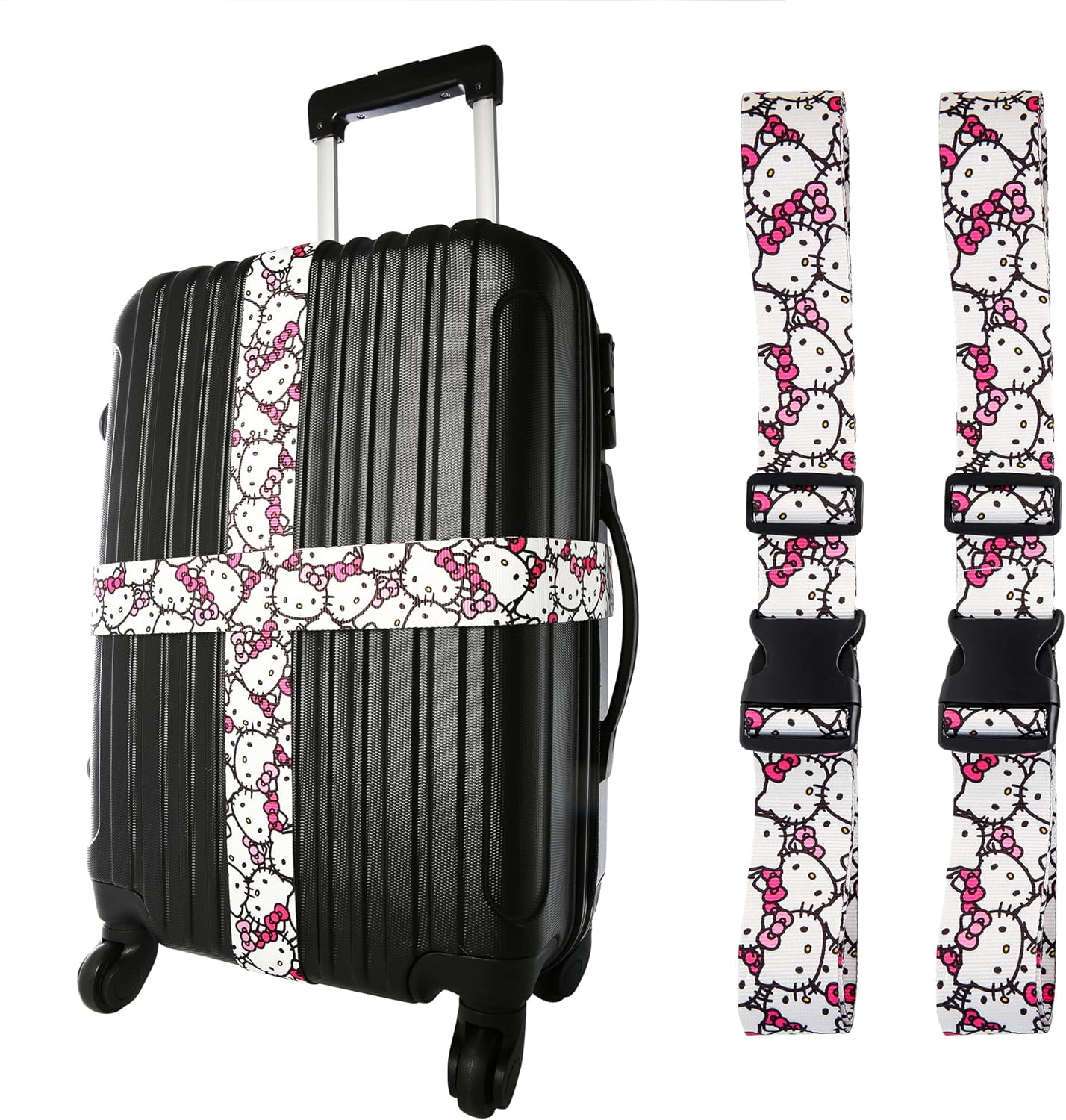 Official License Hello Kitty Travel Accessories: Add an extra layer of security to your suitcases with this pair of Hello Kitty luggage straps. A white, pink, and red Hello Kitty print enhances the suitcase belts for cute Sanrio style.