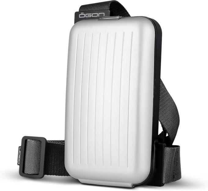 The practical and stylish aluminium sling with an integrated wallet