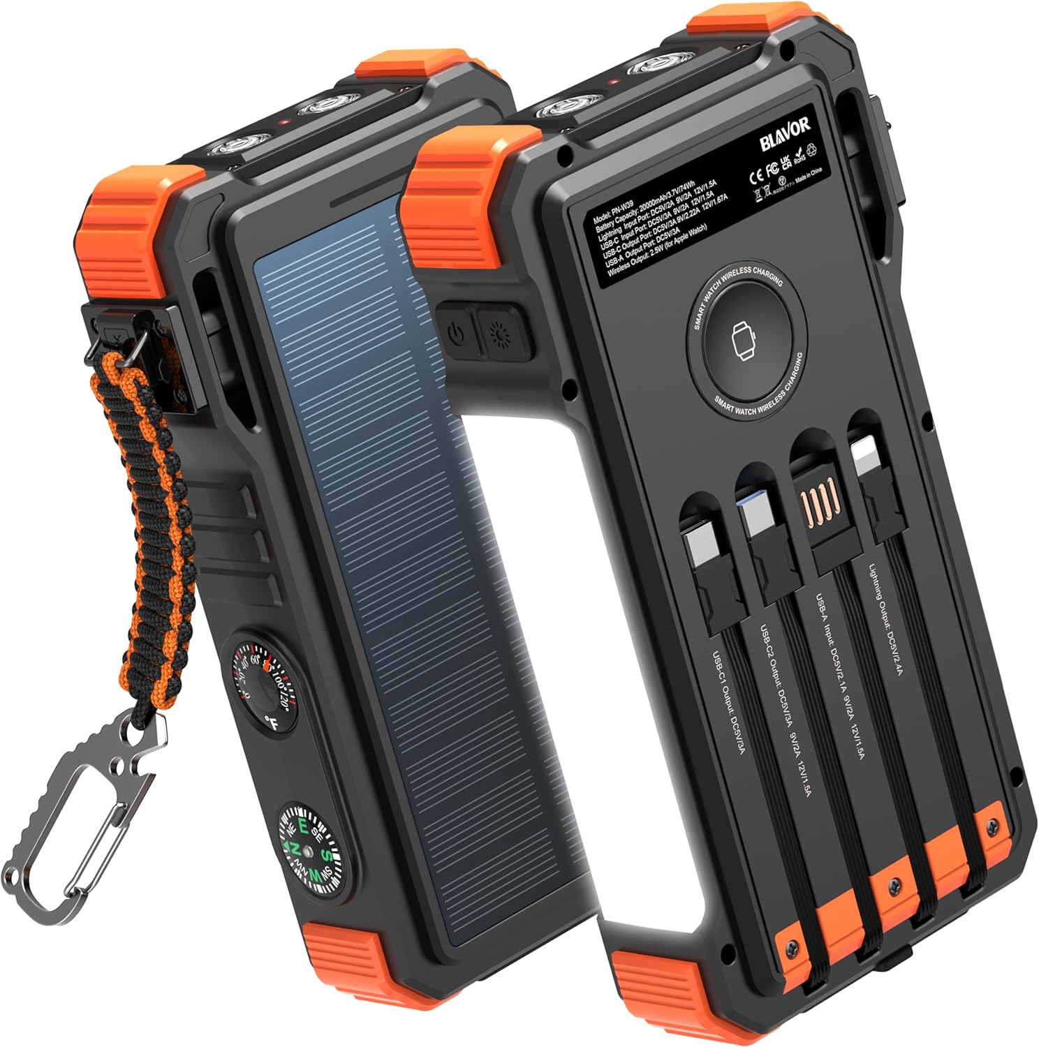 Durable And Adventure-Ready: Built to withstand anything nature throws at it, the BLAVOR solar charger power bank is a true warrior. Its flame retardant ABS+PC shell and waterproof silicone protection make it waterproof, shockproof, and dustproof, ensuring it can handle extreme conditions with ease. No matter where your adventures take you, this charger is up for the challenge
