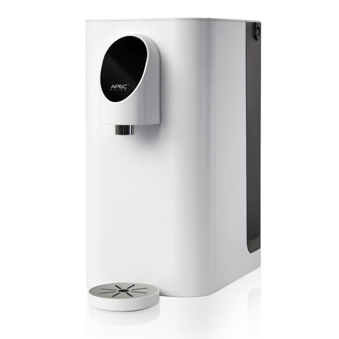The APEC ROCT-PLUS is designed to provide impeccably pure water and aesthetically pleasing design in the home. Dispenses water as hot as 203 degrees or adjusts to your preference with highly accurate precision between ± 2°. Featuring a 3-in-1 reverse osmosis cartridge and high-powered UV light for optimal water purification. 1st STAGE: PP cotton sediment filter for large particulates. 2nd STAGE: RO membrane effectively removes Chromium, PFAs, fluoride, salt, heavy metals, nitrates, arsenic, chlorine, chloride, and other harmful impurities. 3rd STAGE: Post-carbon layer polishes/improves taste. Lastly, water passes through high powered ultra-violet light ensuring nothing remains except purified water. The digital display provides indication of water quality (TDS), filter replacement reminder, whether UV light is on, and child lock option to prevent injury. Experience bottled water quality without the cost and environmental impact, and with all the more convenience of pure refreshing water on-demand within your home.