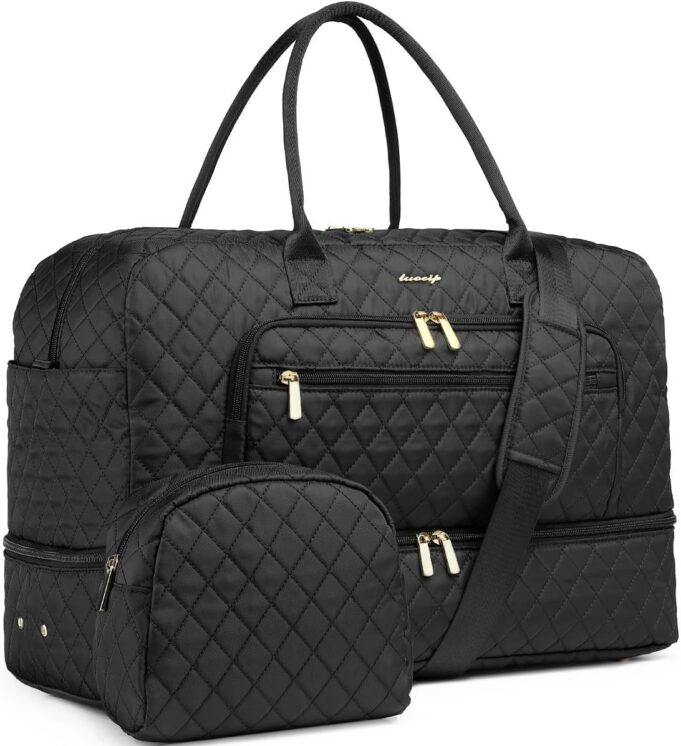 Free Toiletry Bag & Separated Wet Gym Bag: The travel bags for women comes with a toiletry bag to store your cosmetics/toiletries. The toiletry bag is nice for medicines, hair stuff. This black gym tote bag for women has a waterproof PVC lined pocket that separates wet and dry items like clothes, towels and swimsuits. Our womens gym bag is a perfect reliable companion for both indoor and outdoor sports