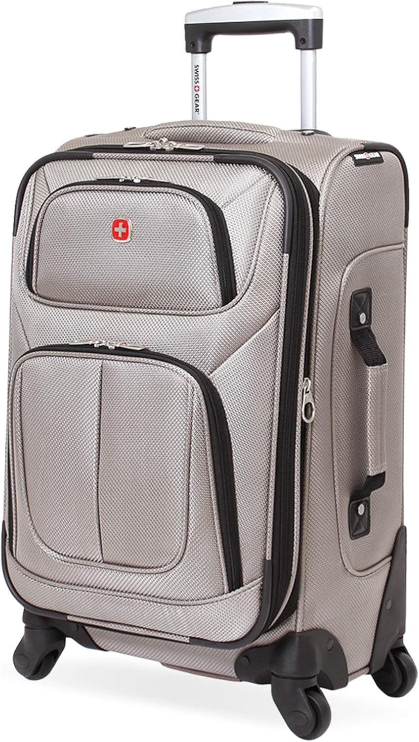 SwissGear Sion Softside Expandable Carry-On Spinner Luggage gives you an ample amount of packing space when needed. This rolling suitcase features a locking push/pull handle system and four 360-degree multi-directional spinner wheels for convenient portability. It is made from a durable, scuff-resistant polyester fabric and its interior is fully lined. This carry-on suitcase features adjustable luggage tie-down straps for securing garments in place, a removable zippered wet bag, a large mesh lid pocket, and a packing pocket for holding small items and accessories. It also includes two front panel pockets, a built-in ID tag, and padded top and side handles. At SwissGear, we continue to ensure whatever you need travels easily, safely, and stylishly with you. Great for a family trip or business travel.